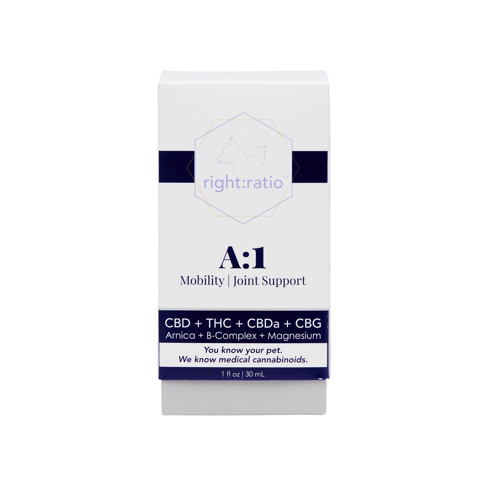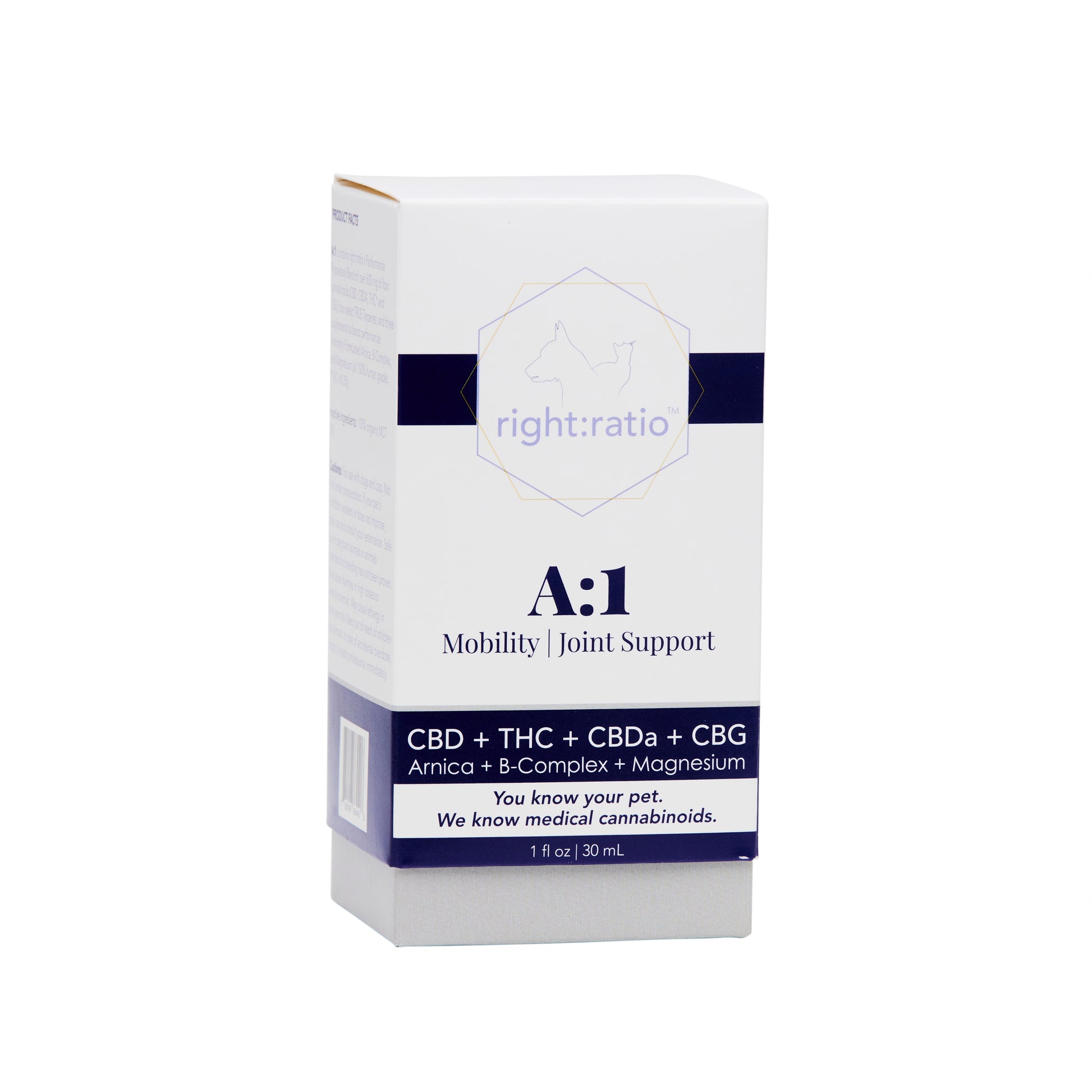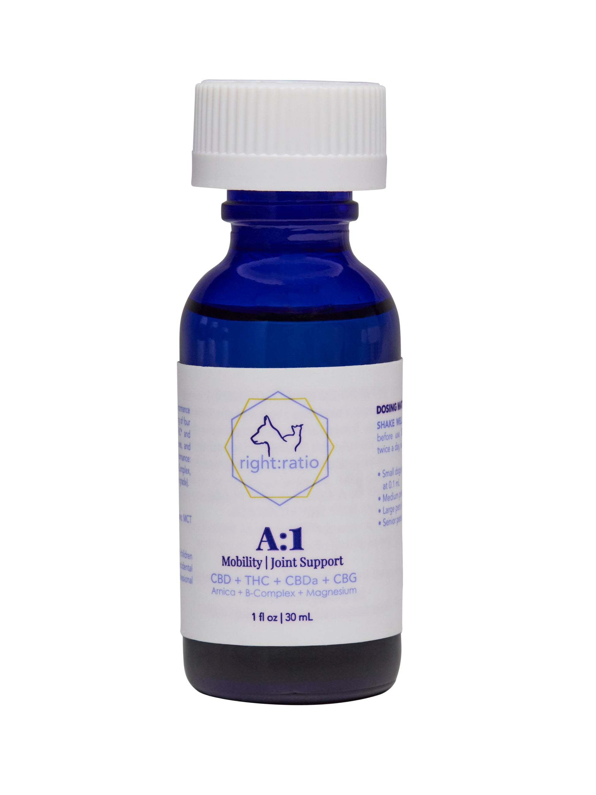 A:1 is a proprietary blend of CBD, THC, CBDA, and CBG with select terpenes boosted by Magnesium, B-Complex and Arnica to help promote mobility and healthy joints for canines and felines.